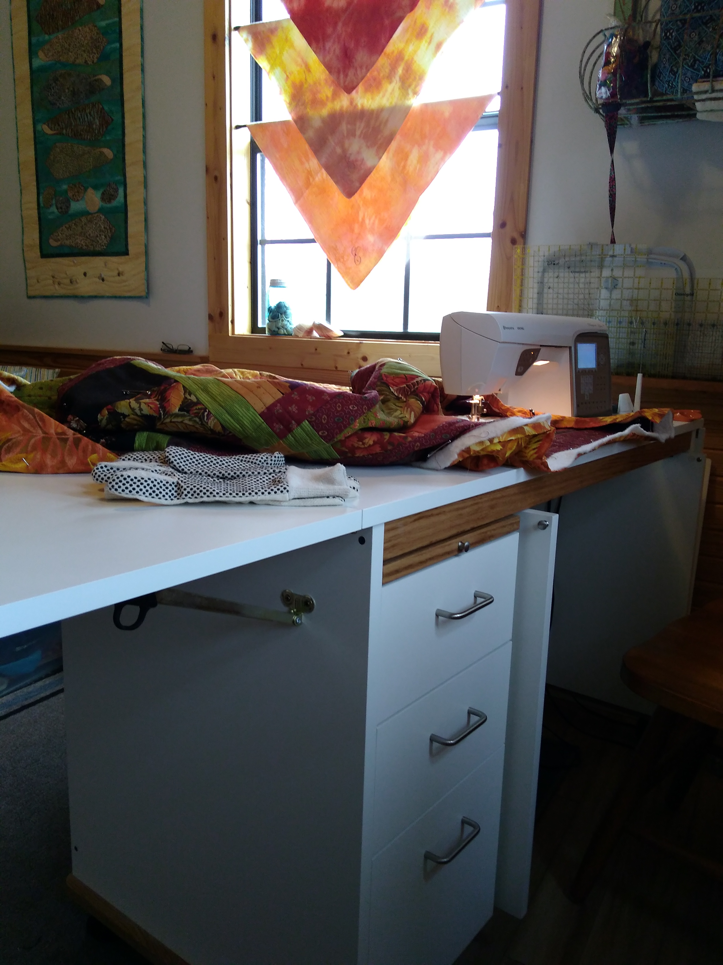 My husband built me a sewing room at our winter home. I have had a small seeing table which has served me well. However, this year I really wanted to be able to do more quilting with comfort. This morning Mike at Tracey’s Tables delivered and installed my new addition. This afternoon I have making good use of it. When I finish this humanitarian quilt I have couple more plus 2-3 for me. It’s sew wonderful!!