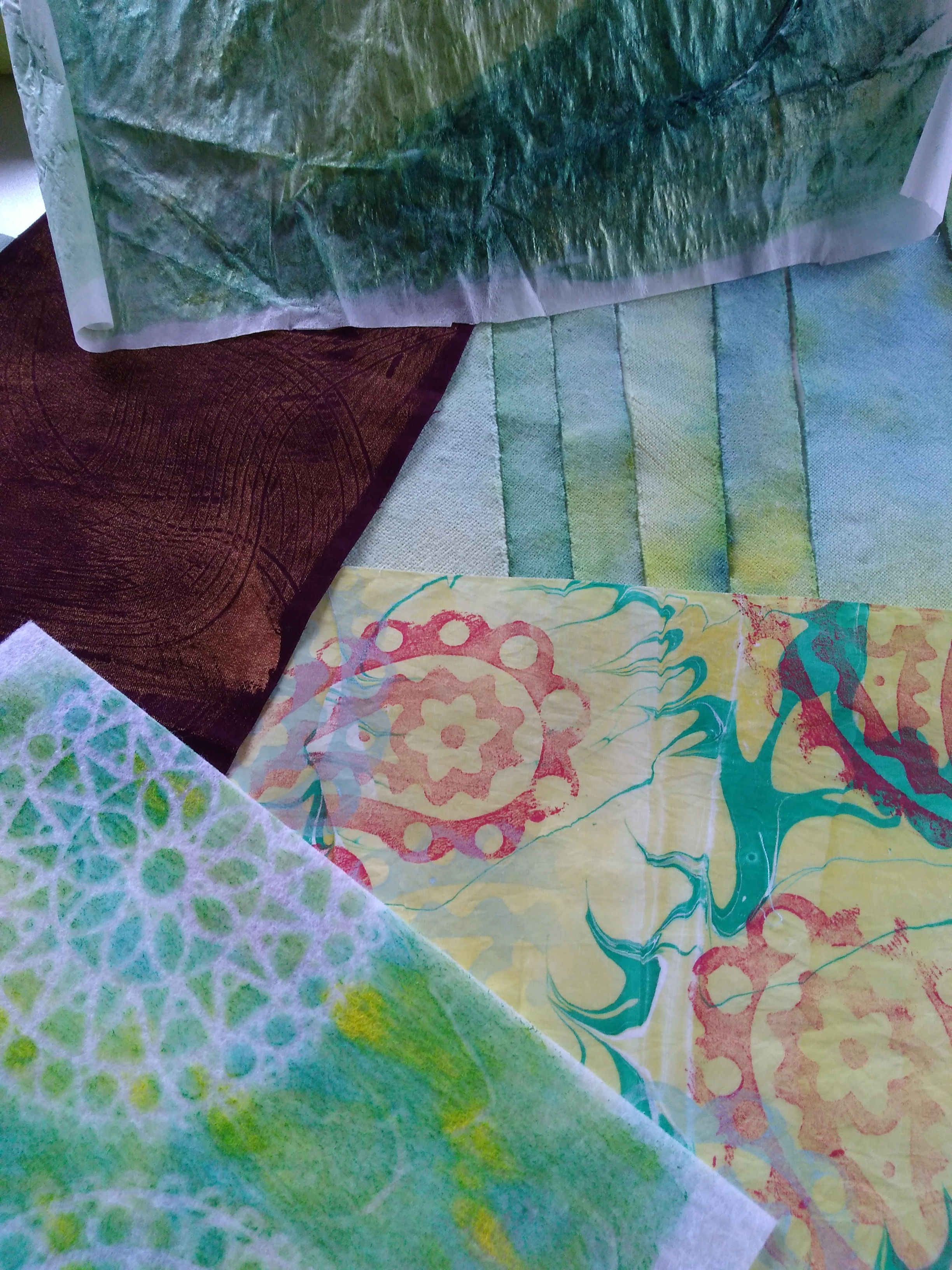 Yesterday was “paint to your hearts content” day. Along with a Texas friend we painted, stamped and printed on anything lying lose in the sewing room. From the top: paper backed fusible web, necktie interfacing, marbled fabric scraps, fusible fleece and a dark polyester sueded fabric. Creative soul sisters (and brothers) will know how fun it is to just play and maybe,without planning, have some interesting results. I feel an artsy project or two or maybe even three coming on!