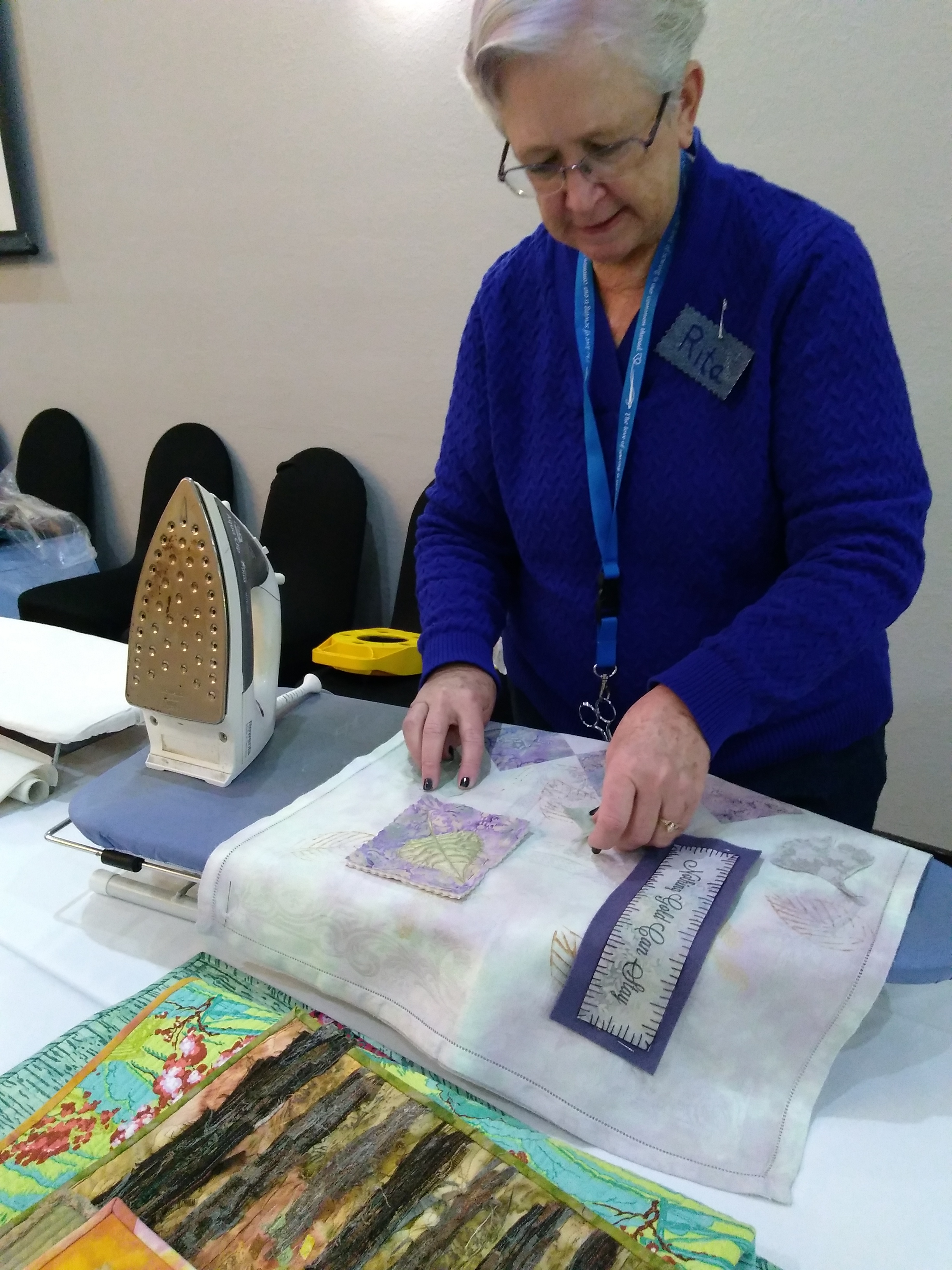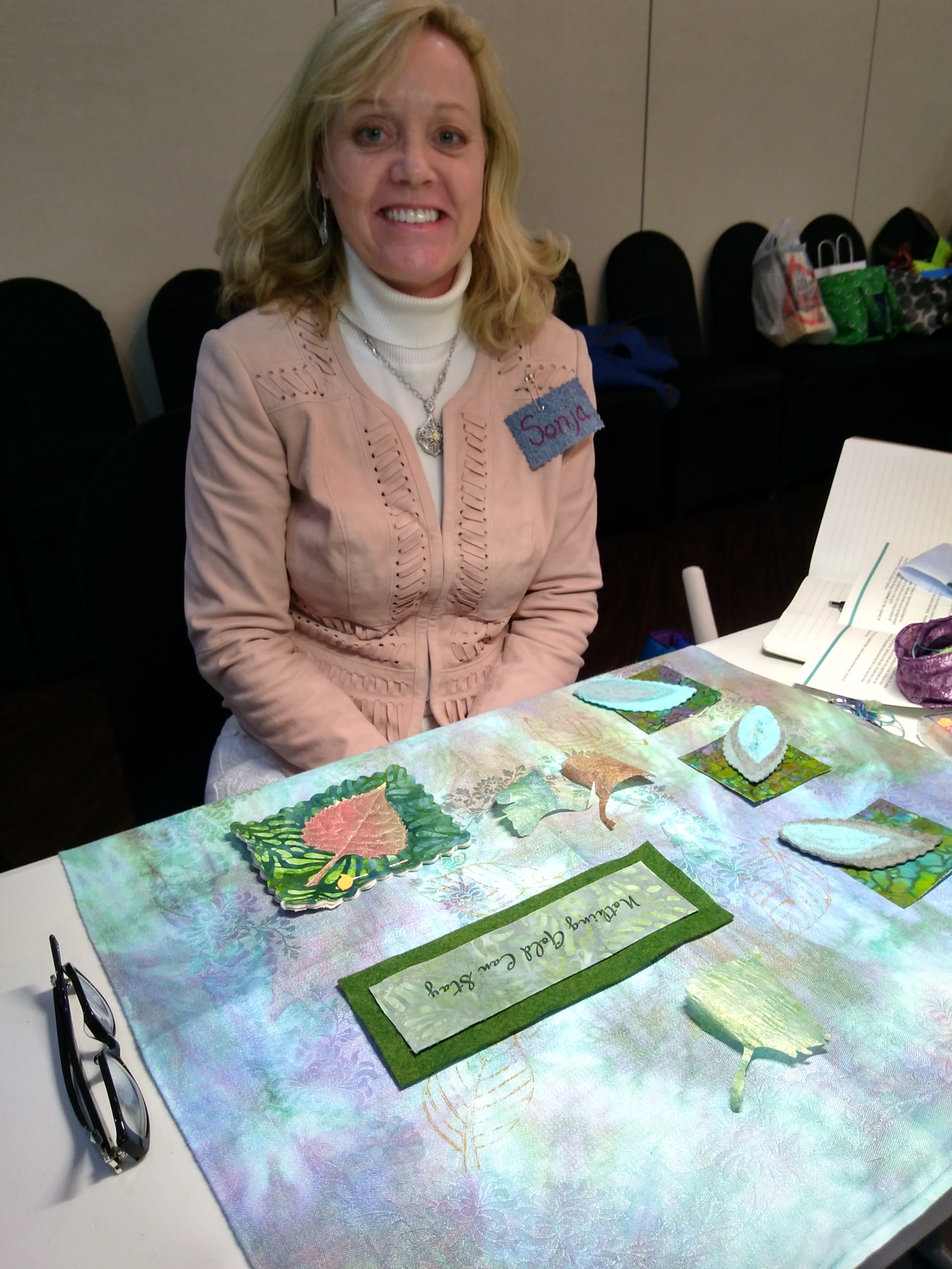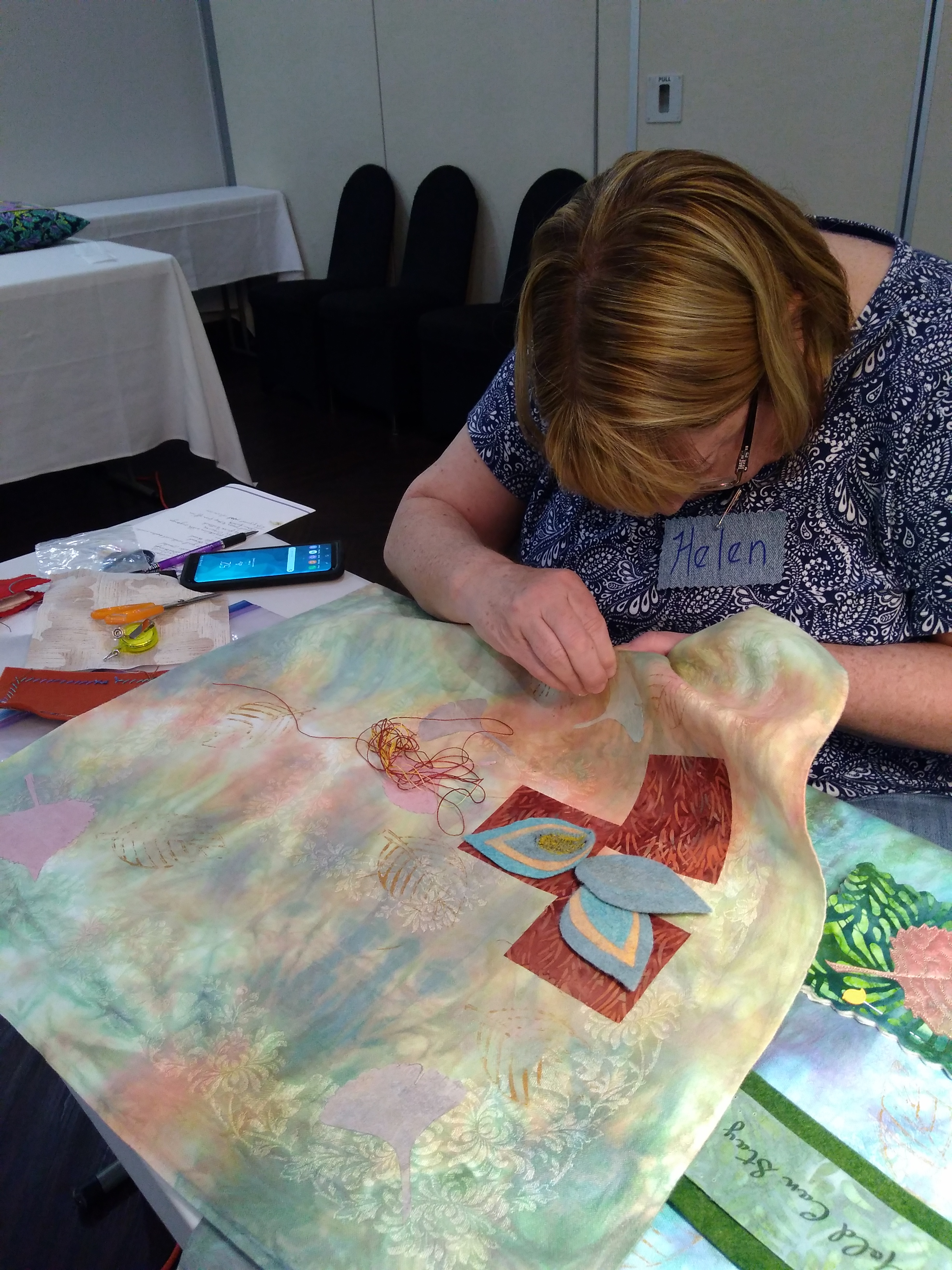 It was intense concentration as students worked on their artful collage titled “Nothing Gold Can Stay”. My hand dyed vintage linens we’re the base with felted leaves, painted Tyvek leaves, and painted fusible web leaves being placed on the background with beautifully organic embroidery stitches. A fun teaching opportunity for me in Quincy, Illinois!