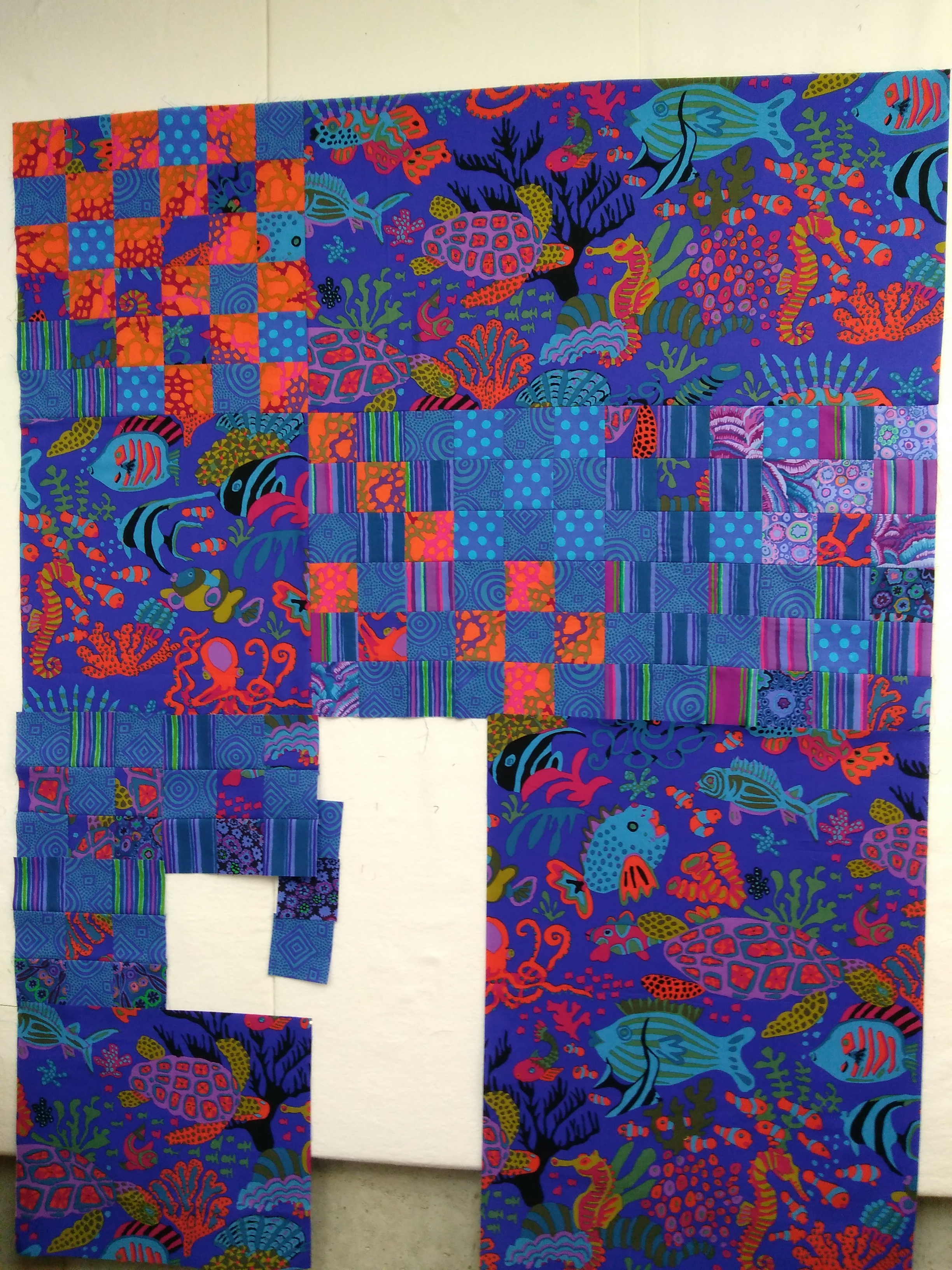 I have not used blue in quilts for a while so when this new fish fabric came in with bright coral type print a panel-like quilt came to mind. Simple squares sewn into a nine patch formation surround the larger squares and rectangles. I’m thinking the bottom small squares will be the darker blues and a title might be Blue Seas of KFC. We’ll see when it comes time to quilt. Will it be bubbled or waves with rays of sunshine breaking the surface? Hmm, time to ponder the final layout.