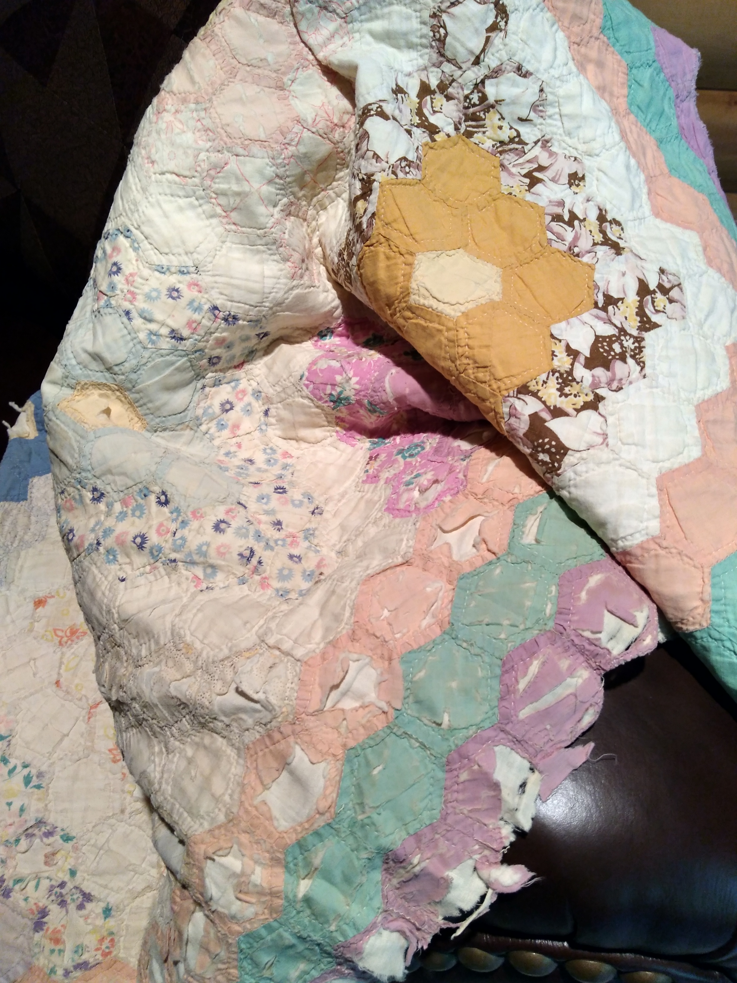 Ragged, tattered, faded and torn but still holding memories of my growing years. This quilt was hand stitched, hand quilted and then turned and buttonhole stitched around each hexagon with lots of love by my grandmother. I surely did not appreciate the workmanship at the time I curled beneath it. Now that I can understand the many hours that went into it’s making I shall try to figure out how to preserve it as pieces from the past.
