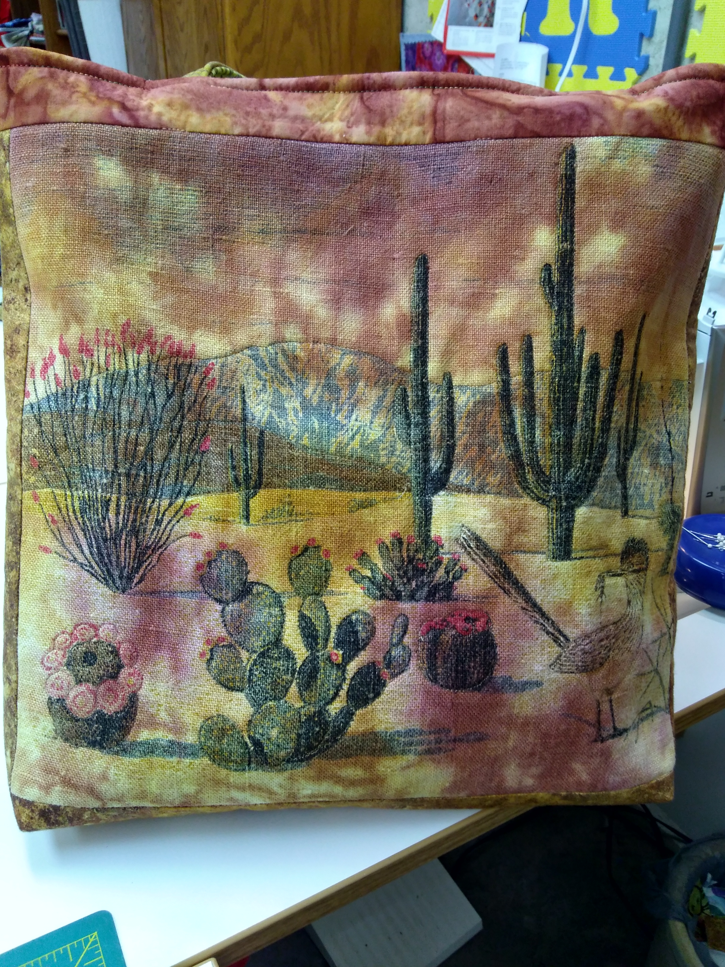 Remember those linen towels picked up as souvenirs from your travels? I pick them up in “trash” boxes at auctions, dye them in appropriate or related color schemes and then……And then they become something stitched, like this tote bag. What fun!!