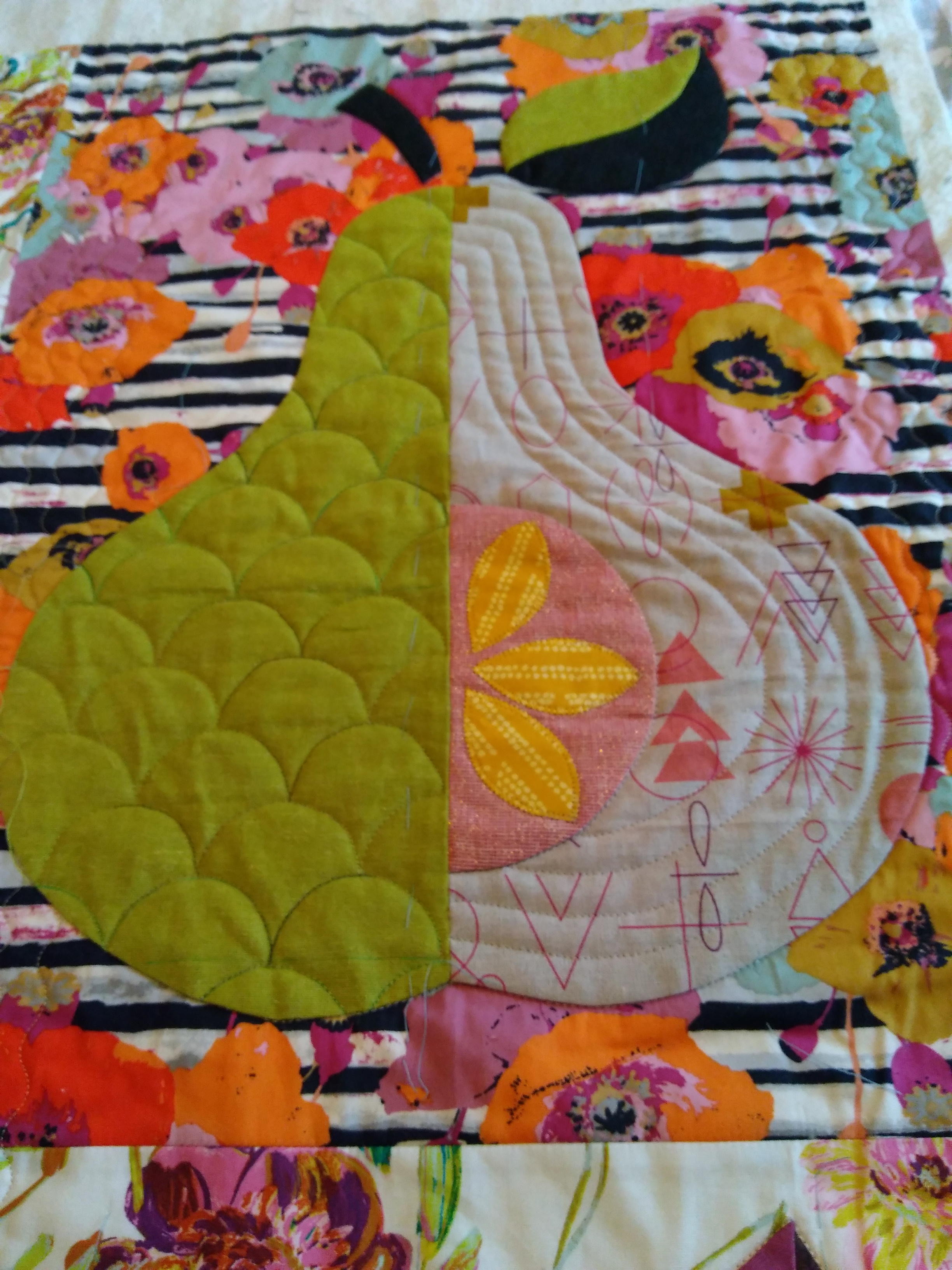 Using Linda Ambrosini’s pattern to have some fun with different fabrics and textures as well as quilting designs. Her pattern reminded me of a design I did for a college art class using blue apples. I may have to create or re-create that design in fabric. Value and repetition we’re the two design elements I focused on although we were always graded on all the elements and principles. Though it’s been almost 50 years since my original design done in paper I can still recall it quite clearly!!! Wonder what grade I received.